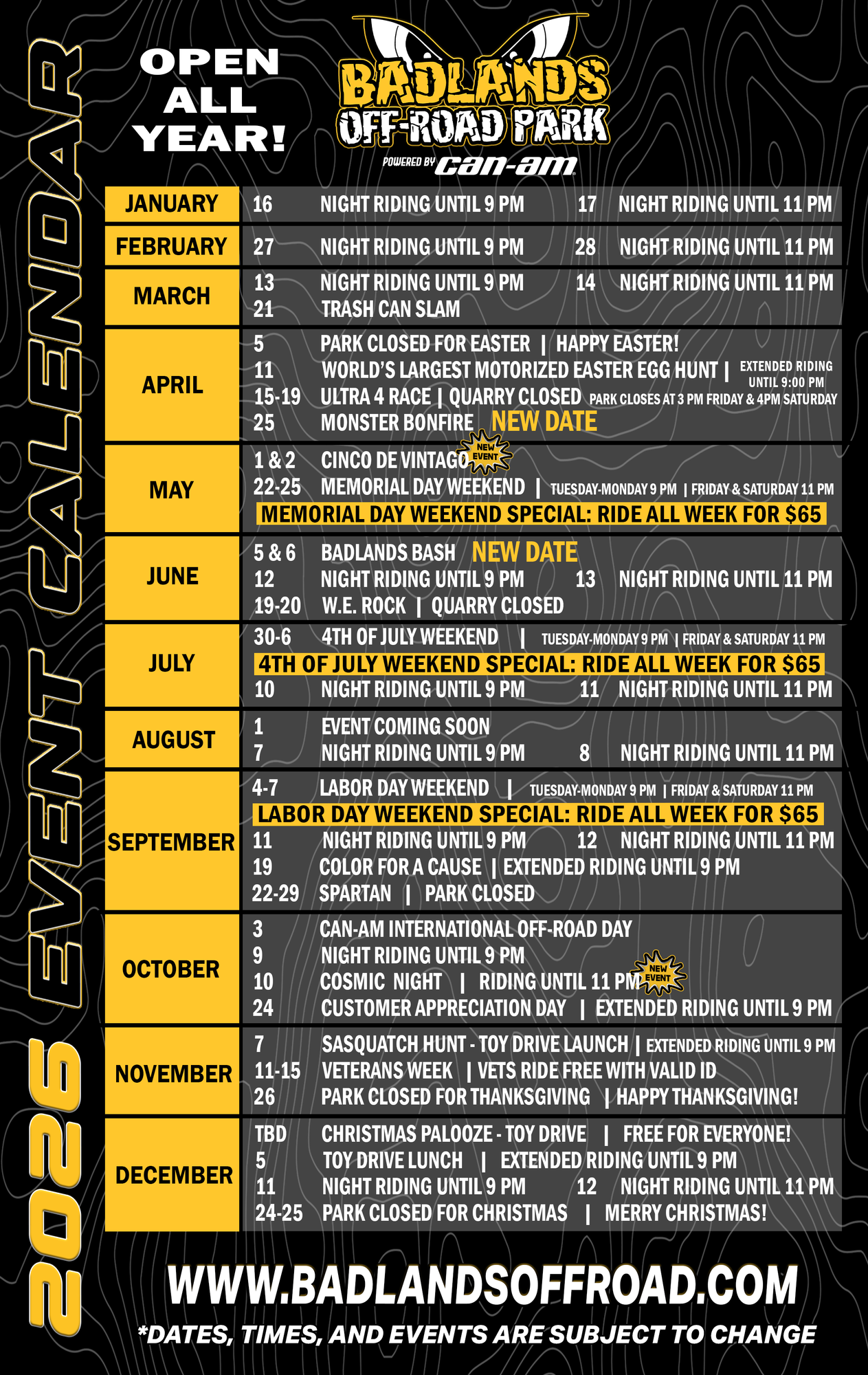 Badlands Pro Shop Hours Notice: The Badlands Pro Shop will be closed during regular business hours on event days and extended riding days.
